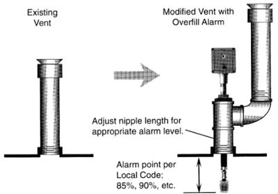 Typical retrofit of existing vent to modified vent with overfill alarm shown. Adjust nipple length for appropriate alarm level. Alarm point based on local code, be sure to check the requirements of your particular region.